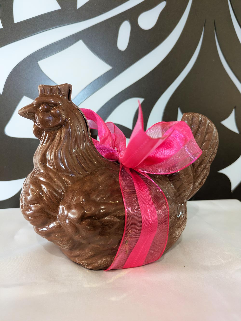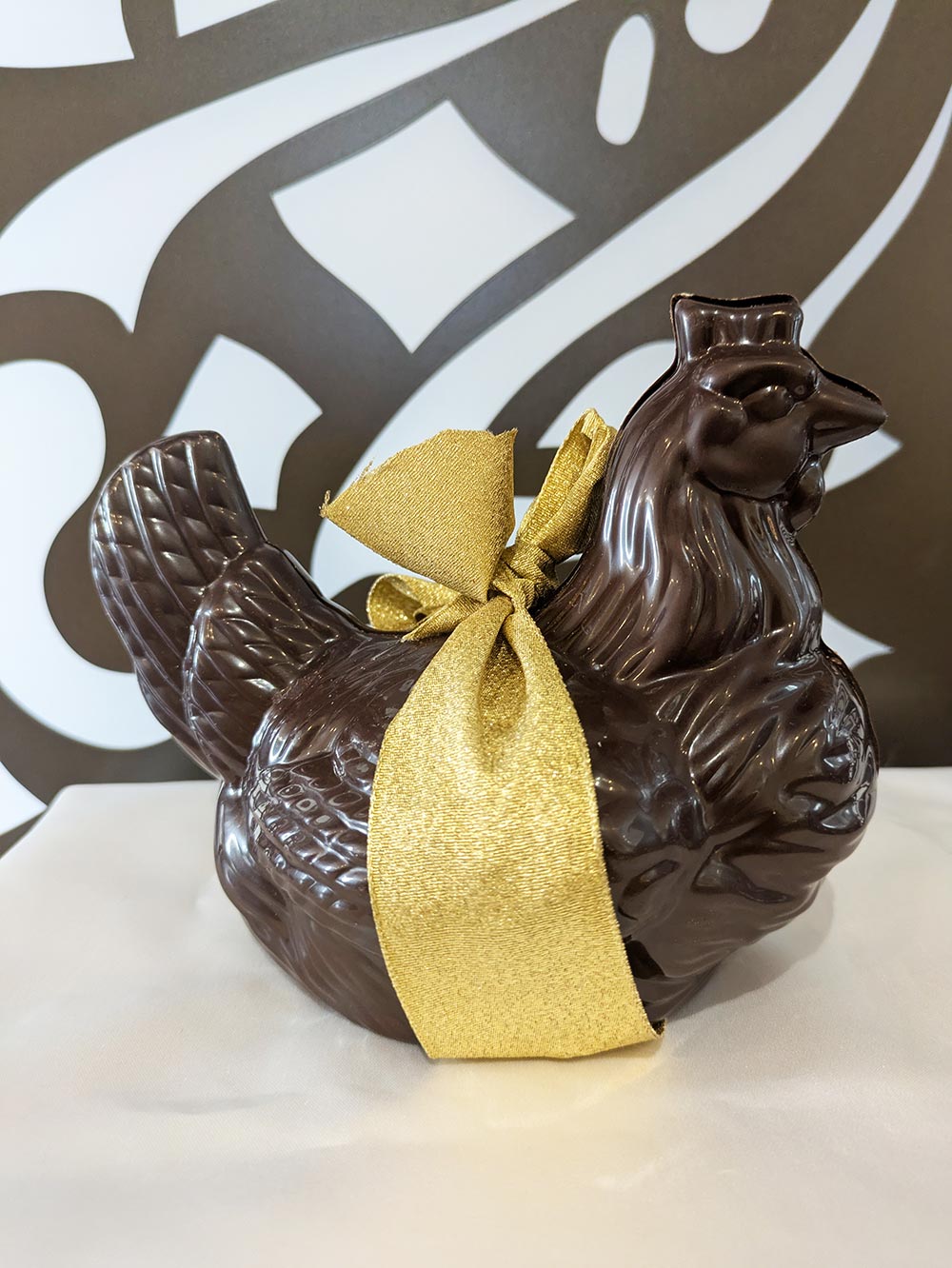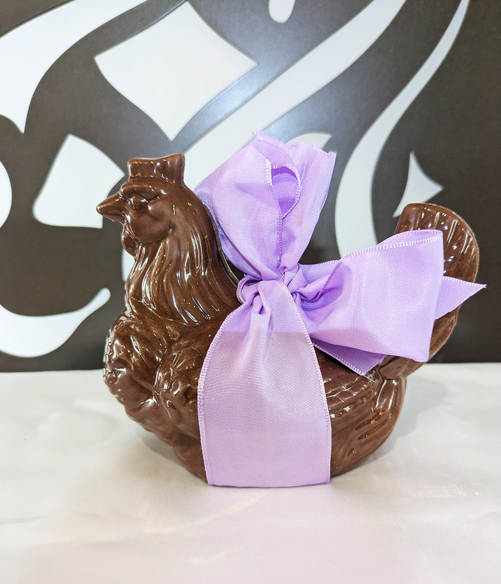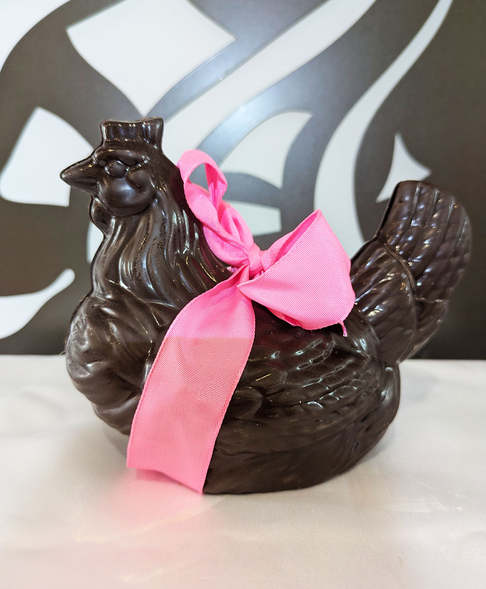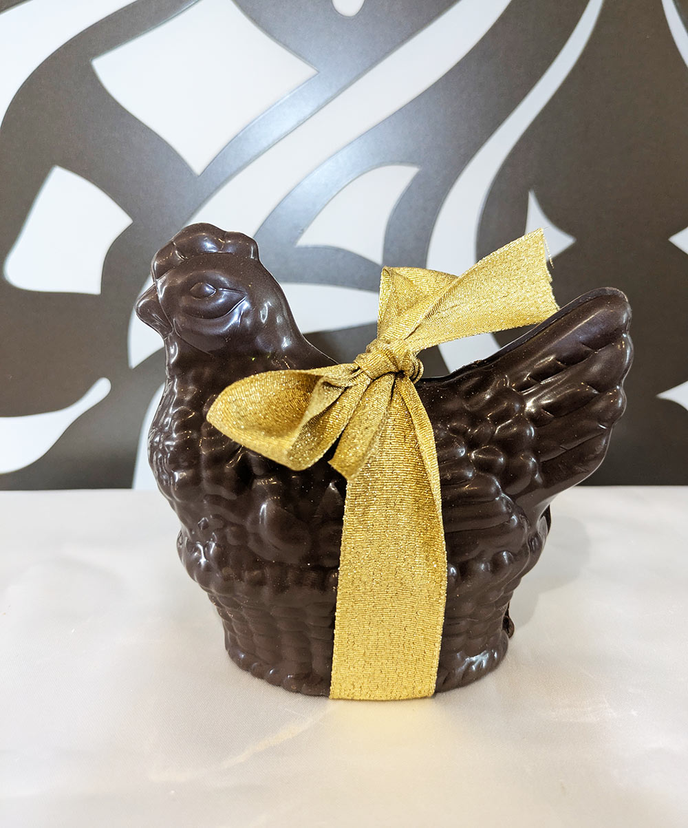 Nos maîtres chocolatiers ont réalisé de somptueuses poules au chocolat au lait, noir ou blanc garnis de sa friture pour le bonheur des petits mais aussi des grands.